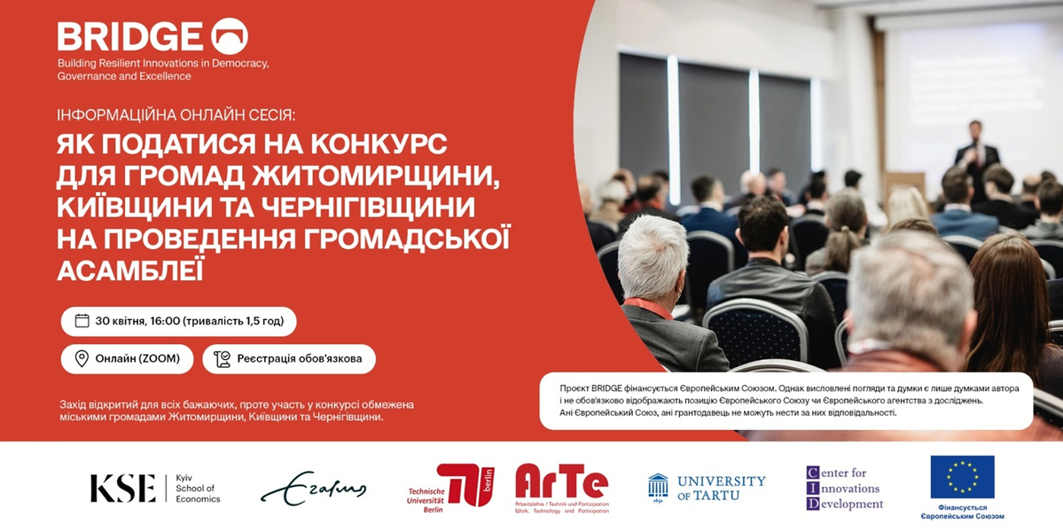 30 квітня 2025 року о 16:00 розпочнеться інформаційна онлайн-сесія проєкту BRIDGE "Проведення громадської асамблеї", присвячена конкурсу для міських громад Житомирської, Київської та Чернігівської областей на проведення громадської асамблеї.
