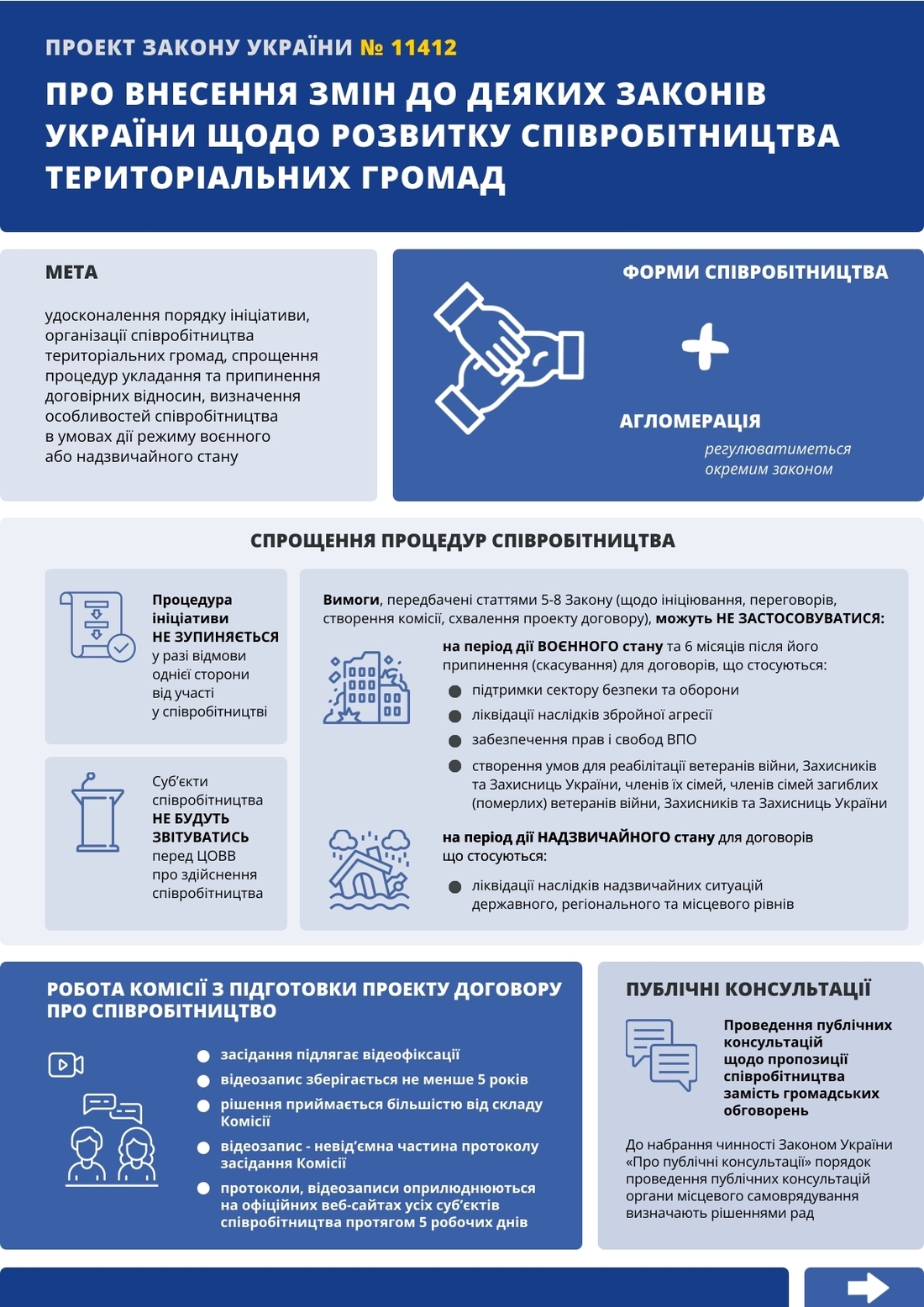 Парламентський Комітет з питань організації державної влади, місцевого самоврядування, регіонального розвитку та містобудування 12 травня 2025 року представив проєкт Закону України про внесення змін до деяких законів України щодо розвитку співробітництва територіальних громад (№11412). За результатами засідання Комітету 29 квітня 2025 цей проєкт рекомендовано Верховній Раді України прийняти в другому читанні та в цілому.