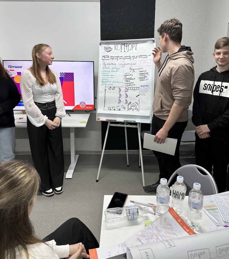 Окрім усього, DECIDE виділив мінігрант – 50 тисяч гривень. Усе – аби діти мали змогу доповнити укриття власними задумами та зробили його більш зручним і «своїм». Так, спочатку експерти DECIDE вчили учнівські команди писати та презентувати проєкти.