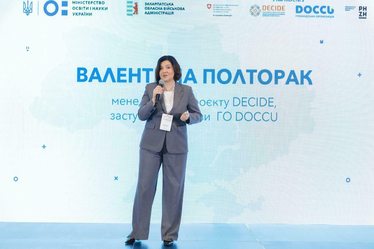 Валентина Полторак, менеджерка Швейцарсько-українського проєкту DECIDE зауважила, що реформа старшої школи є частиною ширшого процесу децентралізації, тож важливим завданням у цьому контексті є напрацювання спільної державної політики разом із громадами: