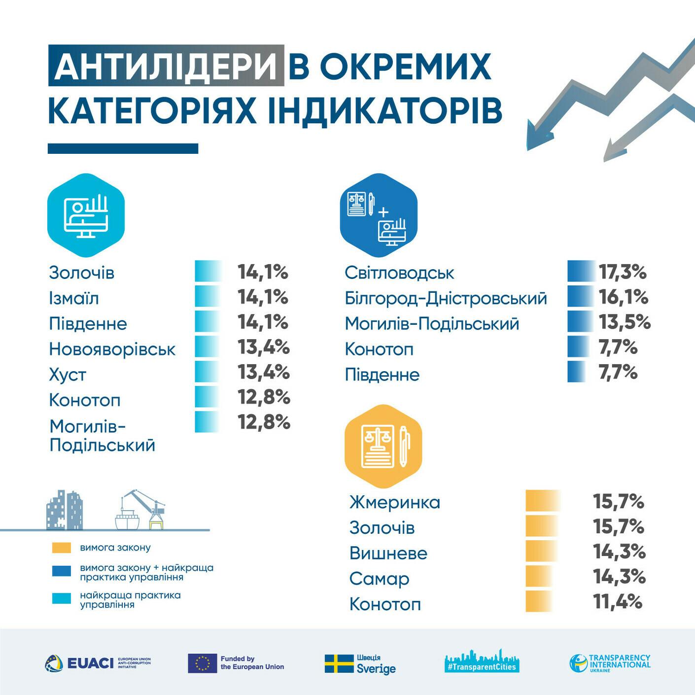 Проте серед 100 досліджуваних 72 міста все ще залишились непрозорими. Найгірші результати продемонстрували Конотоп (11 балів зі 100 можливих), Могилів-Подільський (15,5) Золочів (16), Хуст (16,5), Білгород-Дністровський (17,5), Південне і Вишневе (по 19,5), Самар (21,5), Глухів та Ізмаїл (по 22,5).