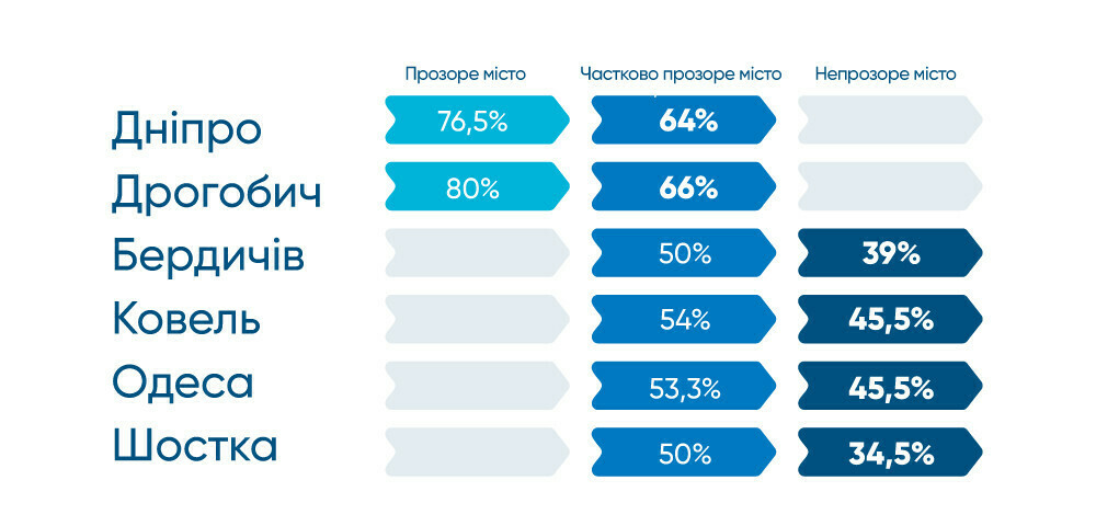 Середній рівень прозорості великих міст найвищий — 59,1%, середніх — 41,7%, а малих — 33,2%.
