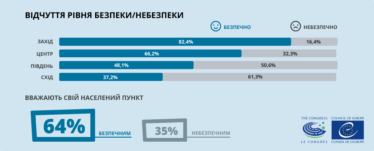 Дослідження, зокрема, показало, що 64% респондентів вважають свій населений пункт скоріше або повністю безпечним, а 35% - скоріше або дуже небезпечним. Частка тих, хто вважає свій населений пункт скоріше або дуже небезпечним, істотно зростає з заходу на схід країни – 16% у західних регіонах, 32% - у центральних, 51% - у південних і 61% - у східних регіонах.