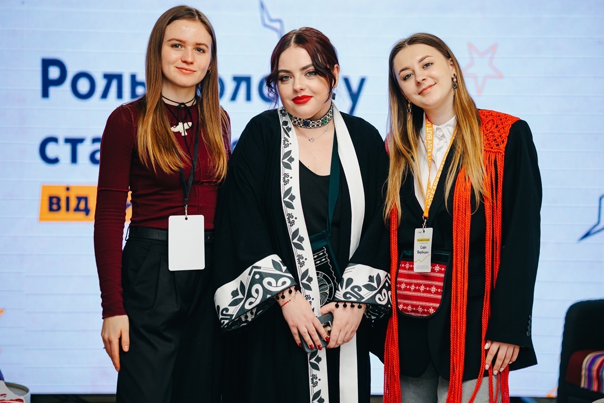 Леся Голояд (у центрі) на форумі ГО «Молодіжна платформа» на тему: «Роль молоді у становленні України: від минулого до сьогодення». Разом із нею – комунікаційні менеджерки ГО «Молодіжна платформа» Софія Вербицька та Софія Прус (ліворуч), які є водночас членкинями молодіжних рад Підгайцівської та Торчинської громад