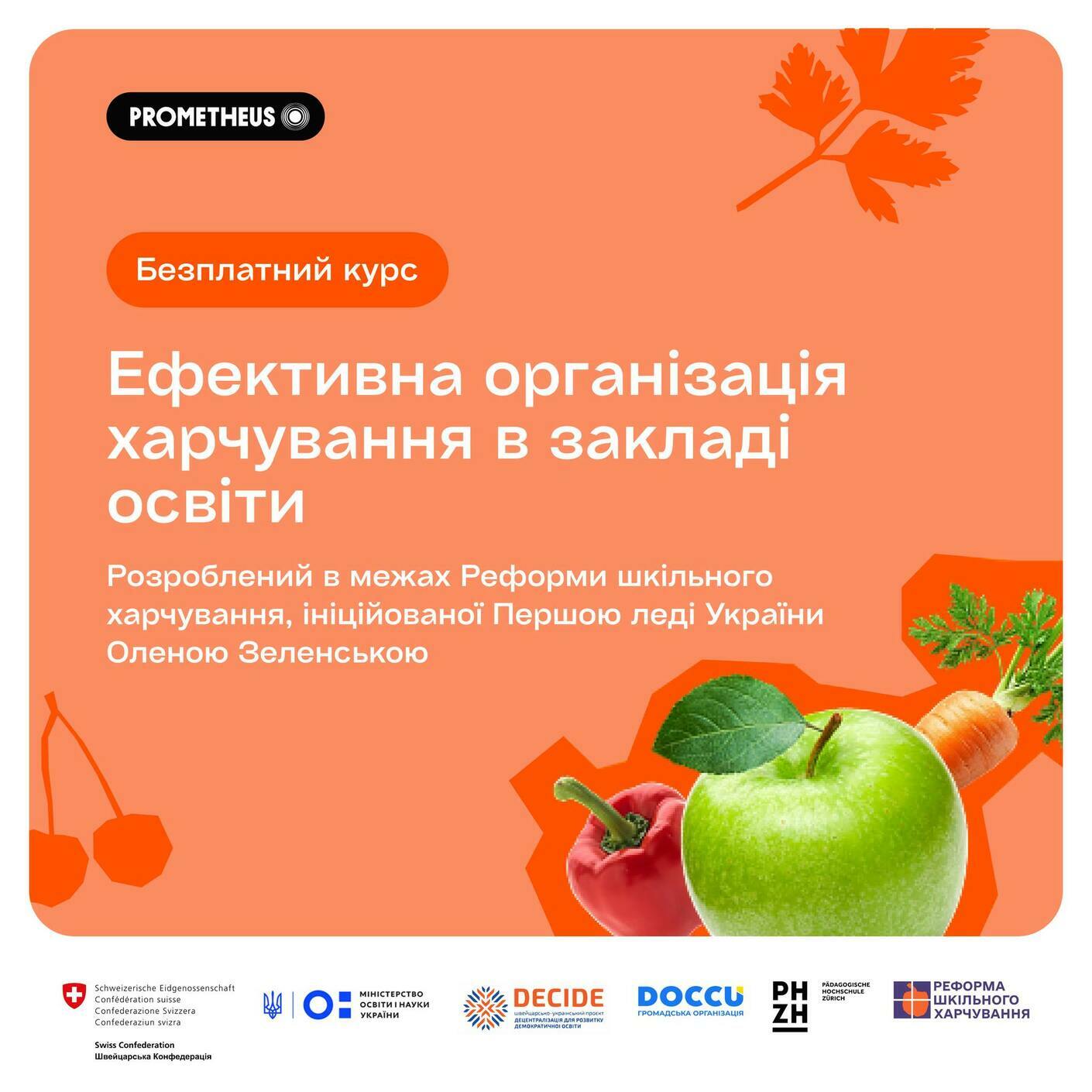 Курс ведуть експерти Швейцарсько-українського проєкту DECIDE, Міністерства освіти і науки України, фахівці у сфері закупівель та нутриціології.