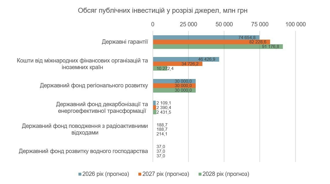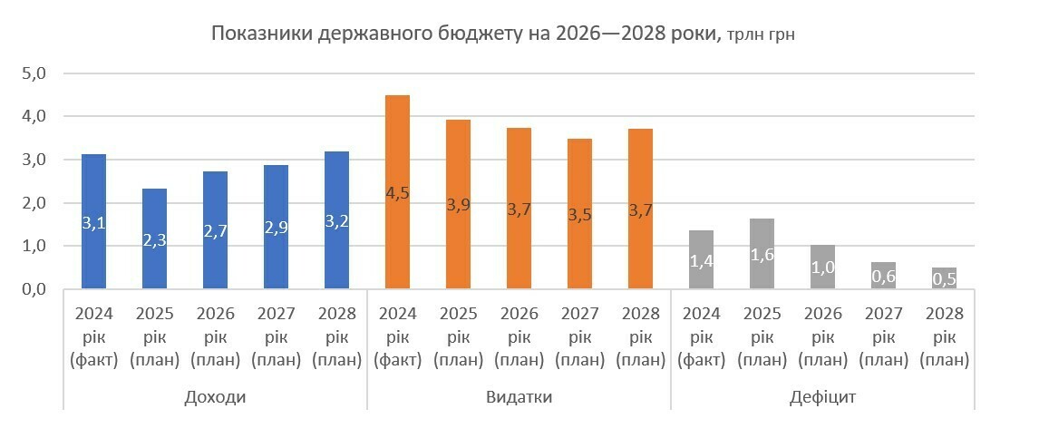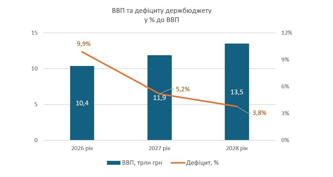 Дефіцит: 1 033,9 млрд грн у 2026 році (9,9% від ВВП). Прогнозується його суттєве скорочення до 619,9 млрд грн (5,2% ВВП) у 2027 році та 511,9 млрд грн (3,8% ВВП) у 2028 році.