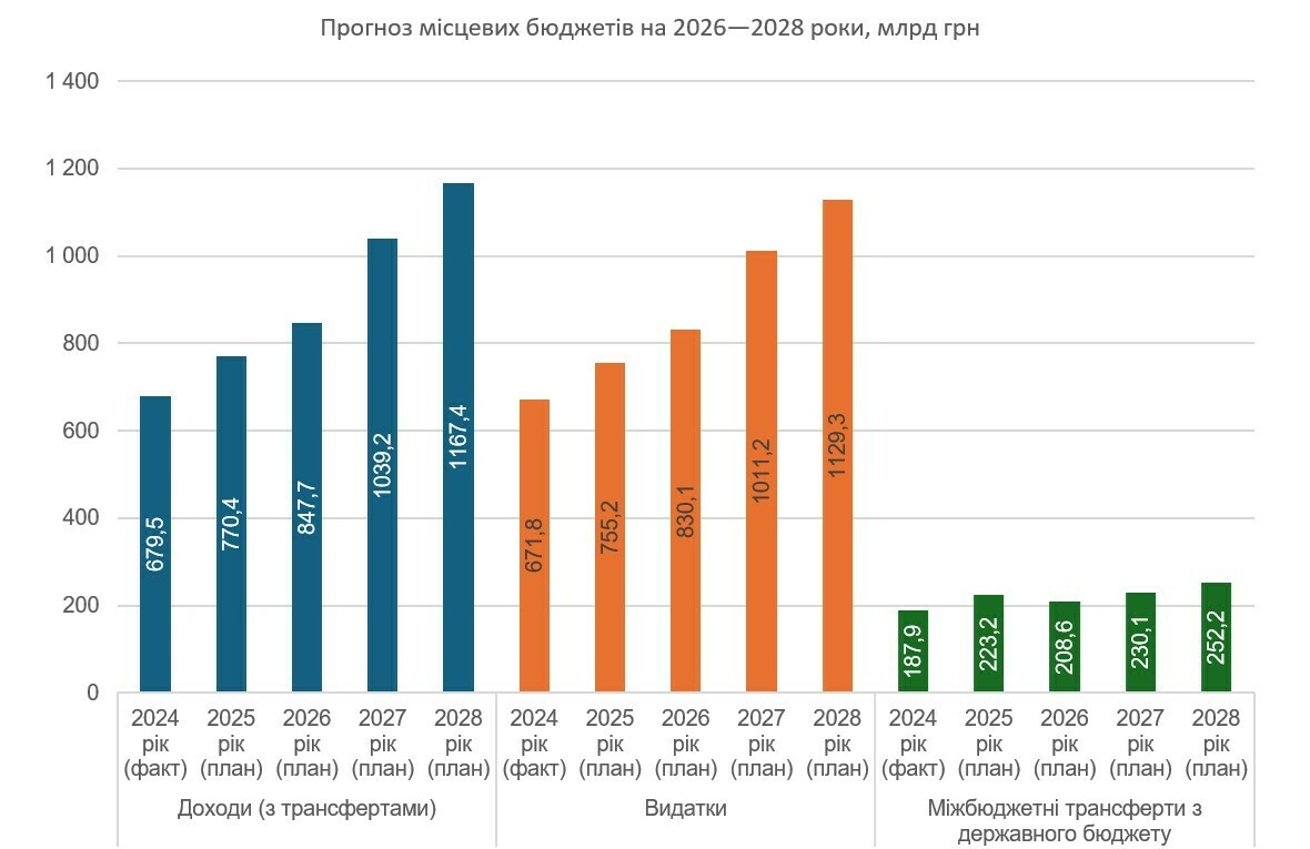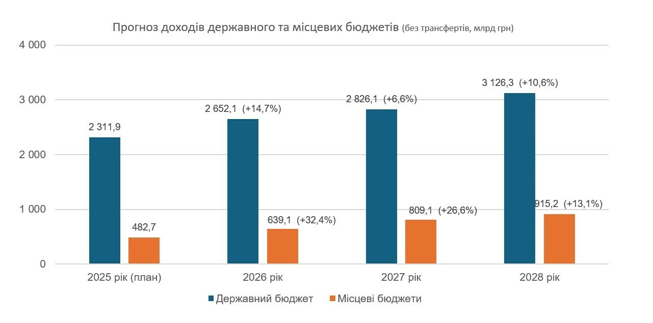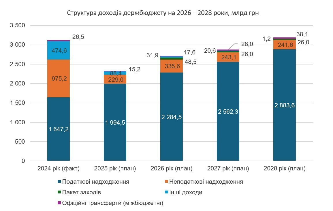 Доходи: 2 718,2 млрд грн (загальний фонд – 2 553,0 млрд грн, спеціальний фонд – 165,1 млрд грн). Прогноз на 2027 рік – 2 880,0 млрд грн, на 2028 рік – 3 190,4 млрд грн.