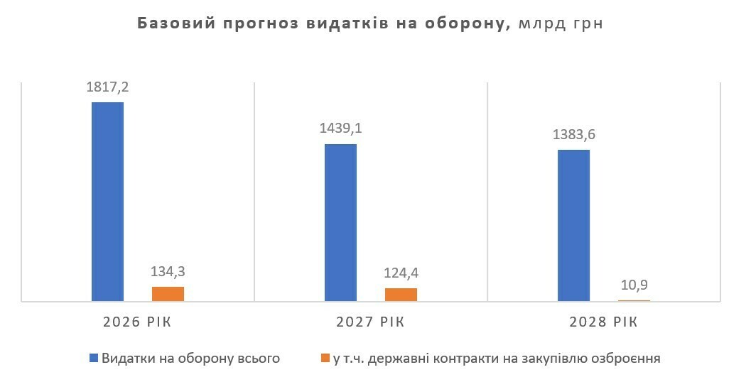 Національна безпека і оборона: залишаються основним пріоритетом. У базовому сценарії видатки на оборону становлять 1 817,1 млрд грн у 2026 році, 1 439,1 млрд грн у 2027 році, 1 383,6 млрд грн у 2028 році, з урахуванням покращення безпекової ситуації. Передбачається розвиток оборонно-промислового комплексу, перехід на контрактну основу ЗСУ, інтеграція з НАТО. Альтернативний сценарій передбачає збільшення видатків на оборону до 2,6 трлн грн (понад 25% ВВП) у 2026 році за рахунок фіскального простору та додаткової зовнішньої допомоги.