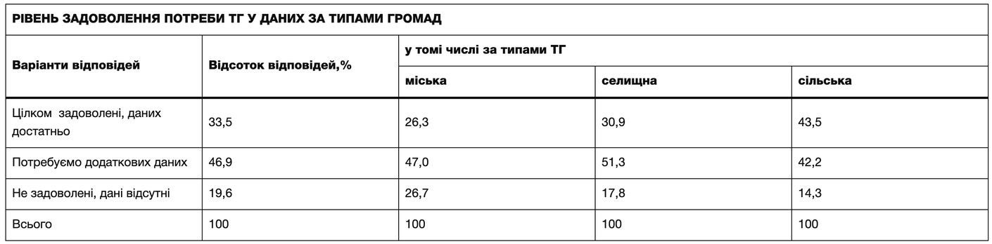 Відповідно до результатів дослідження, майже половина територіальних громад мають потребу в додаткових даних. Причому ця потреба є більш вираженою серед селищних (51,3%) і міських громад (47%).