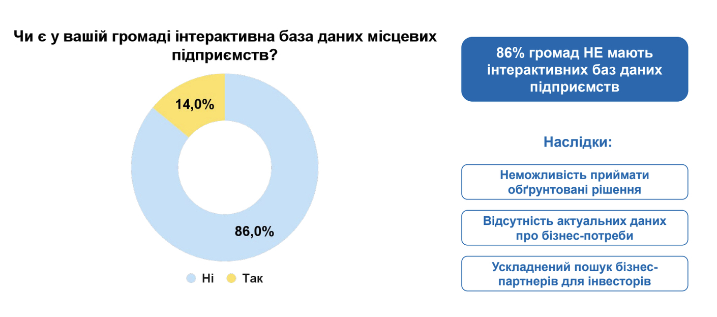 За даними опитування органів місцевого самоврядування та бізнесу, проведеного фахівцями Центру розвитку інновацій, 86% громад зокрема, не мають інтерактивних баз даних підприємств.