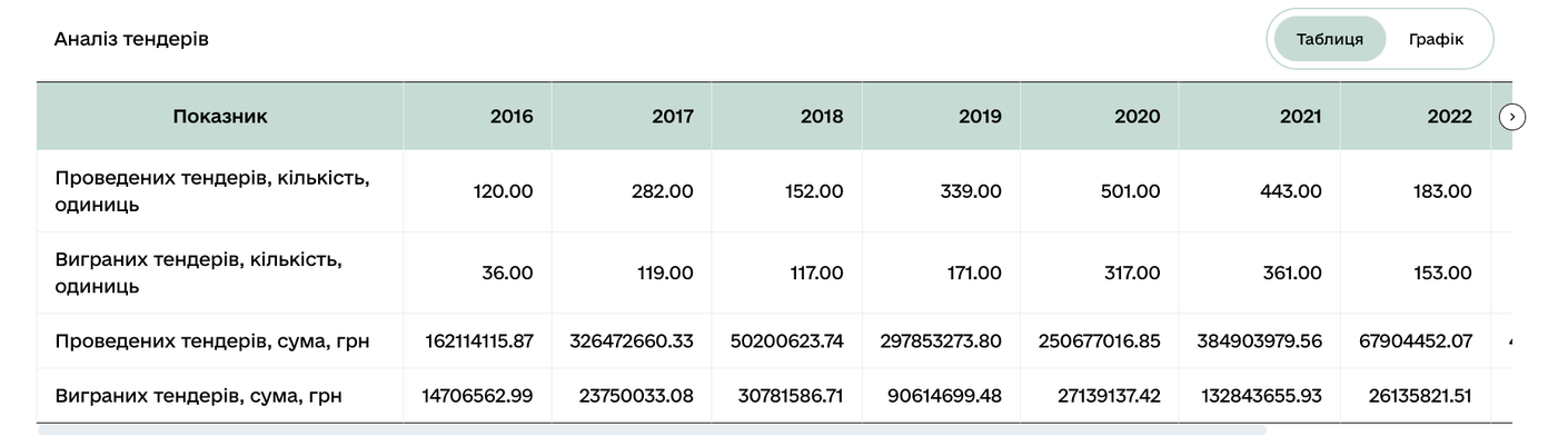 Також наявна інформація щодо проведених тендерів, що дозволяє оцінити потенційні замовлення, рівень конкуренції, загалом аналізувати бюджет громади.