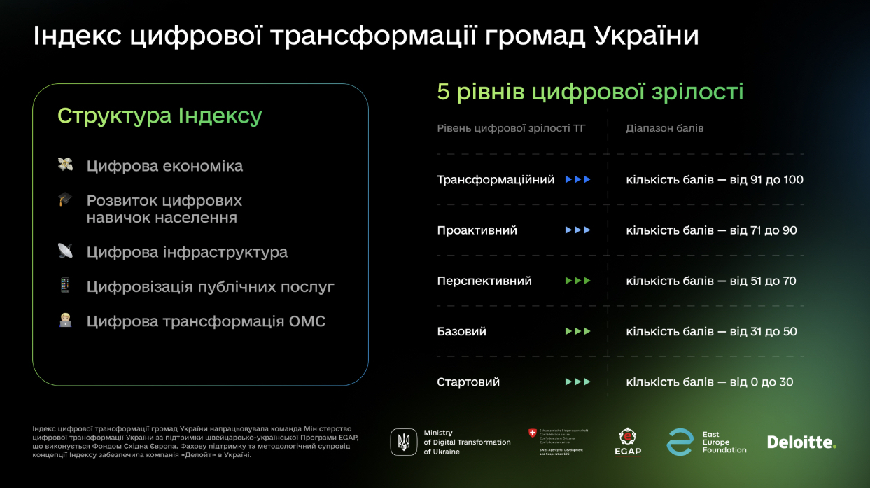 Так, у Міністерстві цифрової трансформації за підтримки швейцарсько-української Програми EGAP, що виконувалася Фондом Східна Європа, та «Делойт», вперше визначали рівень цифрових послуг і розвитку діджитал-інфраструктури в територіальних громадах України.