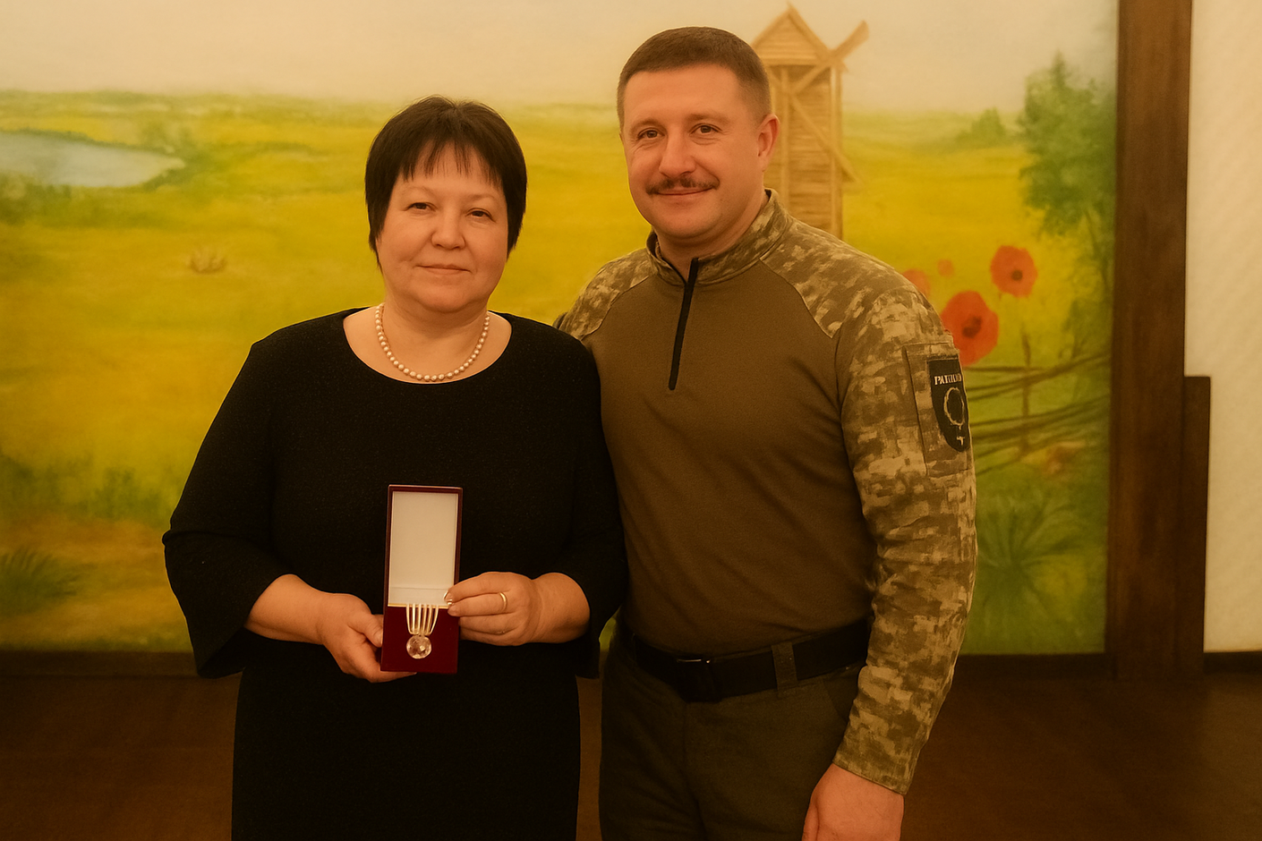 Командувач оперативно-тактичного угруповання «Суми», генерал-майор Олександр Нестеренко вручає Олені Сімі медаль «Почесна відзнака ОТУ «Суми» у вересні 2022 року
