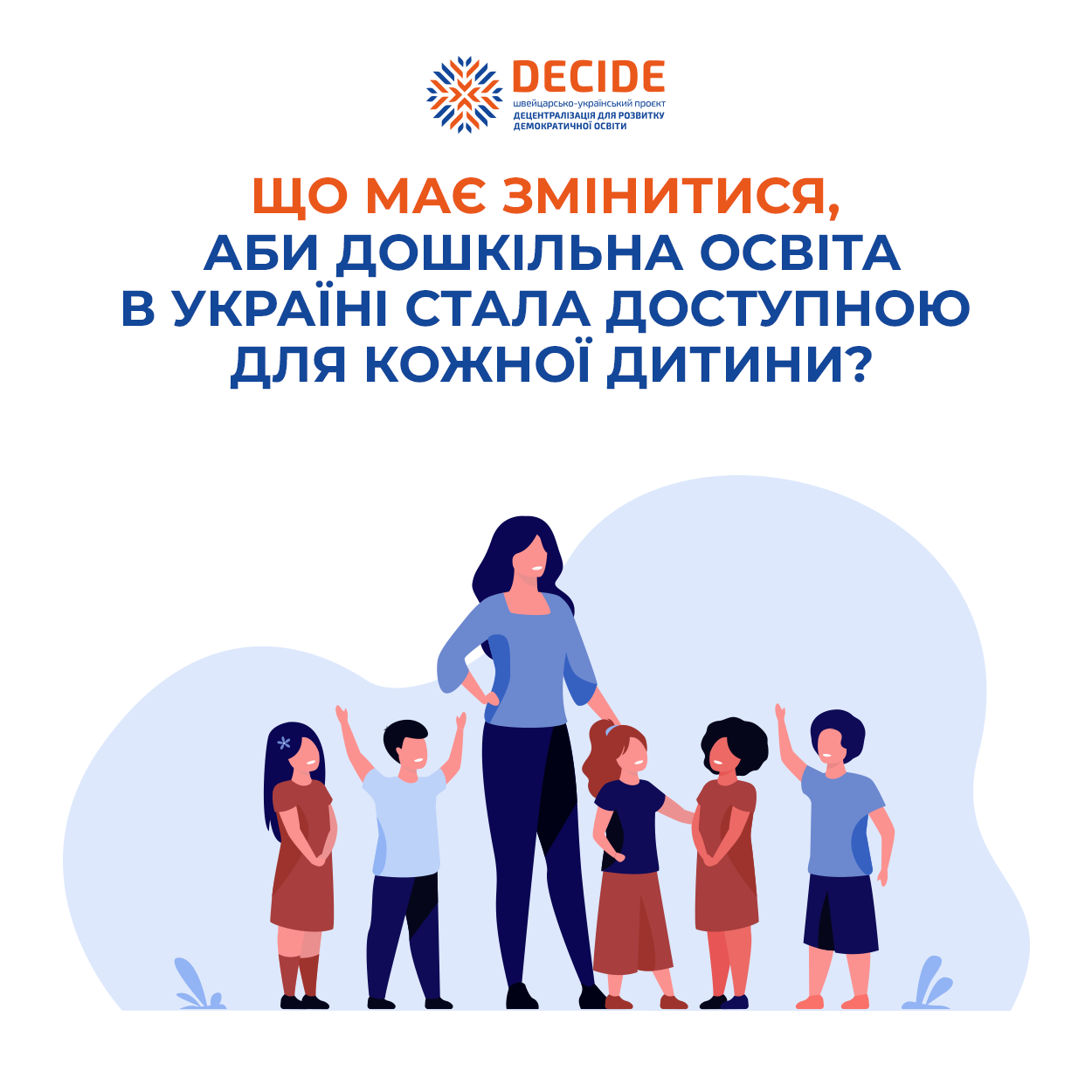 Швейцарсько-український проєкт DECIDE спільно з Асоціацією обʼєднаних територіальних громад провів масштабне опитування «Обговорення стратегічної рамки розвитку дошкільної освіти» серед управлінців освіти з 482 громад. Мета — зʼясувати, що саме заважає громадам розвивати якісну дошкільну освіту і які кроки вони вважають пріоритетними.