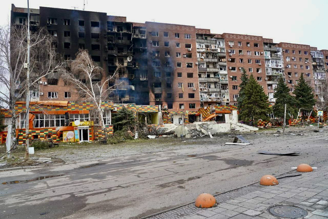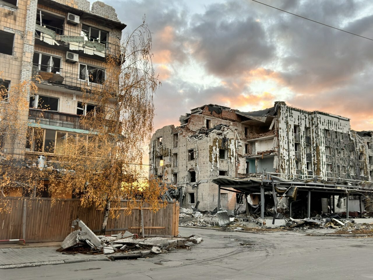 Начальник Покровської військової адміністрації Сергій Добряк поруч зі зруйнованим корпусом Індустріального інституту Донецького національного технічного університету