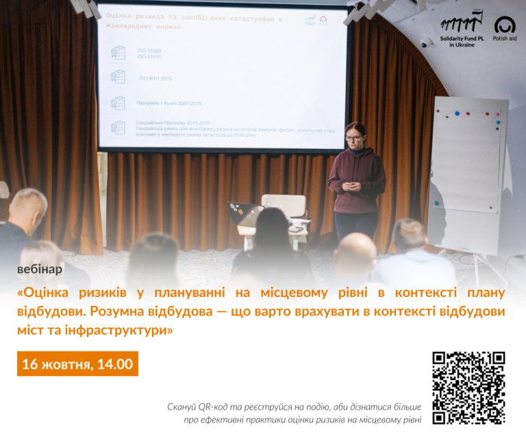 Під час зустрічі розберемо, як громадам швидко й практично провести оцінку ризиків, визначити пріоритети та інтегрувати ці висновки у ключові документи — від стратегій розвитку до планів відновлення.