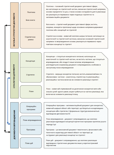 Один з прикладів таких документів – Методологічні рекомендації щодо типології стратегічних та імплементаційних документів. Запропонована типологія представлена на малюнку 2, а сам документ містить їх детальний опис і рекомендовану структуру.
