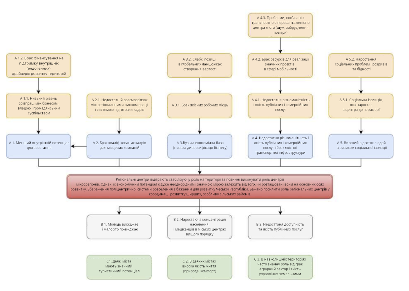 Наведемо приклади дерева проблем для регіональних центрів і вразливих територій. Кожне таке дерево включає опис ключової проблеми (центральний квадратик на схемі), підпроблем/причин (А), наслідків (В) і потенціалів (С).