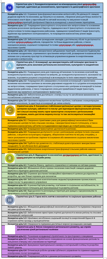 • шість стратегічних цілей, п’ять з яких прив’язані до типів територій, а шоста має горизонтальний характер і стосується якості управління регіональною політикою, що виглядає цікавим доповненням;