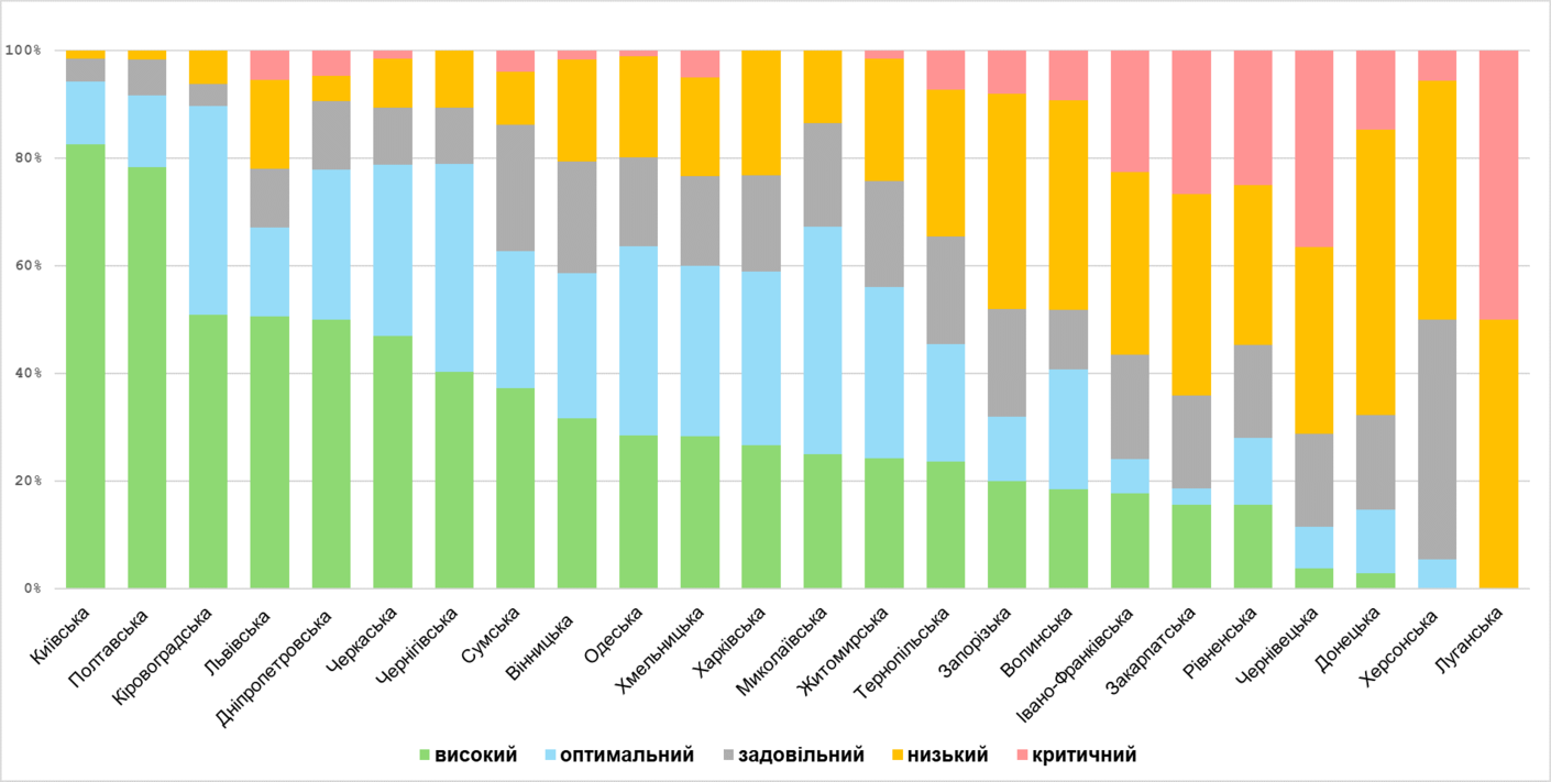 За результатами оцінювання фінансової спроможності 451 територіальна громада включена до категорії високого рівня спроможності (33,9% від кількості громад, по яких здійснювалося оцінювання). Найбільша кількість громад із високим рівнем спроможності у Київській області – 57, у Полтавській – 47, Дніпропетровській – 43. Оптимальний рівень репрезентують 306 територіальні громади (23,0%), з яких найбільша кількість у Одеській області – 32, Дніпропетровській області – 24, Миколаївській та Чернігівській – по 22 територіальні громади. До задовільного рівня віднесено 203 територіальні громади (15,3%), у тому числі: в Одеській – 15, Вінницькій та Житомирській – по 13. До категорії з низьким рівнем належить 269 територіальних громад (20,2%), серед яких у Закарпатській – 24, Волинській та Івано-Франківській – по 21. До категорії з критичним рівнем фінансової спроможності віднесено 102 тергромади (7,7%), з яких у Чернівецькій – 19, Закарпатській – 17, Рівненській – 16.