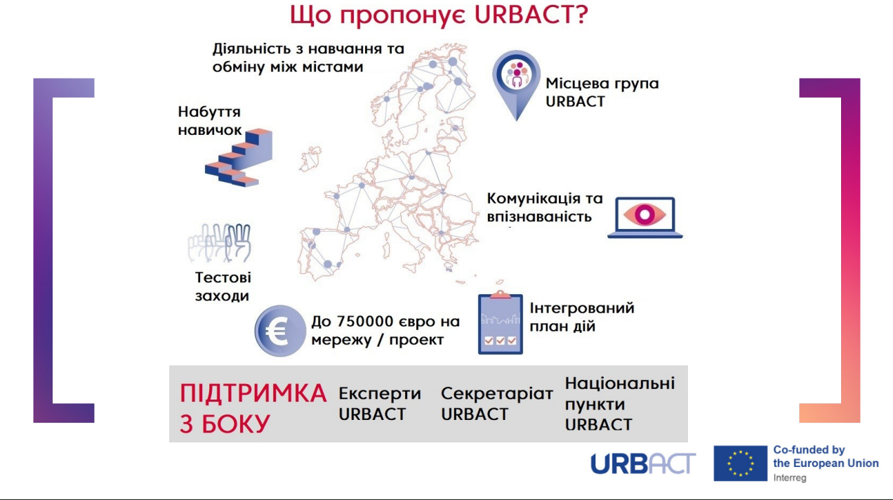 URBACT суттєво відрізняється від інших програм Interreg перш за все тим, що це не інвестиційна програма, тобто не передбачає капітальних видатків. Вона спрямована на те, щоб знайти дієві та інноваційні рішення на місцевому рівні створюючи синергії між різними зацікавленими сторонами - владою, мешканцями, бізнесом, громадськими активістами та обмінюватися напрацюваннями з іншими європейськими містами.