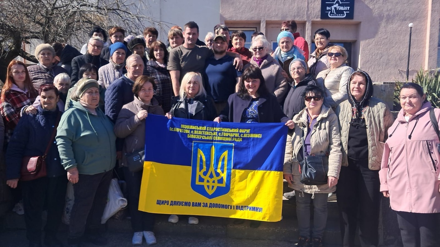 Мешканці сіл Берегове, Велетенське, Гончарне та Кізомис Білозерської громади біля приміщення хабу «Вільні разом» у Миколаєві, 13 березня цього року