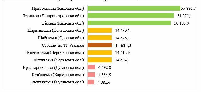 Відповідно до проведеного аналізу сума доходів загального фонду (без урахування трансфертів) у розрахунку на 1 мешканця у 2025 році по територіальних громадах, по яких здійснено розрахунки (тобто, по 1331 тергромаді), в середньому склала 10 397,8 грн/1 особу. У 541 громаді показник доходів на 1 мешканця перевищив зазначений середній рівень.