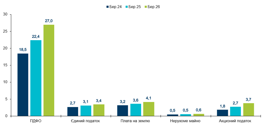 ПДФО традиційно займає найбільшу частку в структурі доходів загального фонду місцевих бюджетів (без трансфертів) – 53,8%. Обсяг надходжень цього податку за березень 2026 року становив 27,0 млрд грн (+20,7% порівняно з березнем 2025 року). Передусім це пов’язано зі зростанням середньої заробітної плати. Згідно з даними work.ua, зарплата з березня 2025 року по березень 2026 року виросла на 18,9% (з 24 000 грн до 28 500 грн).