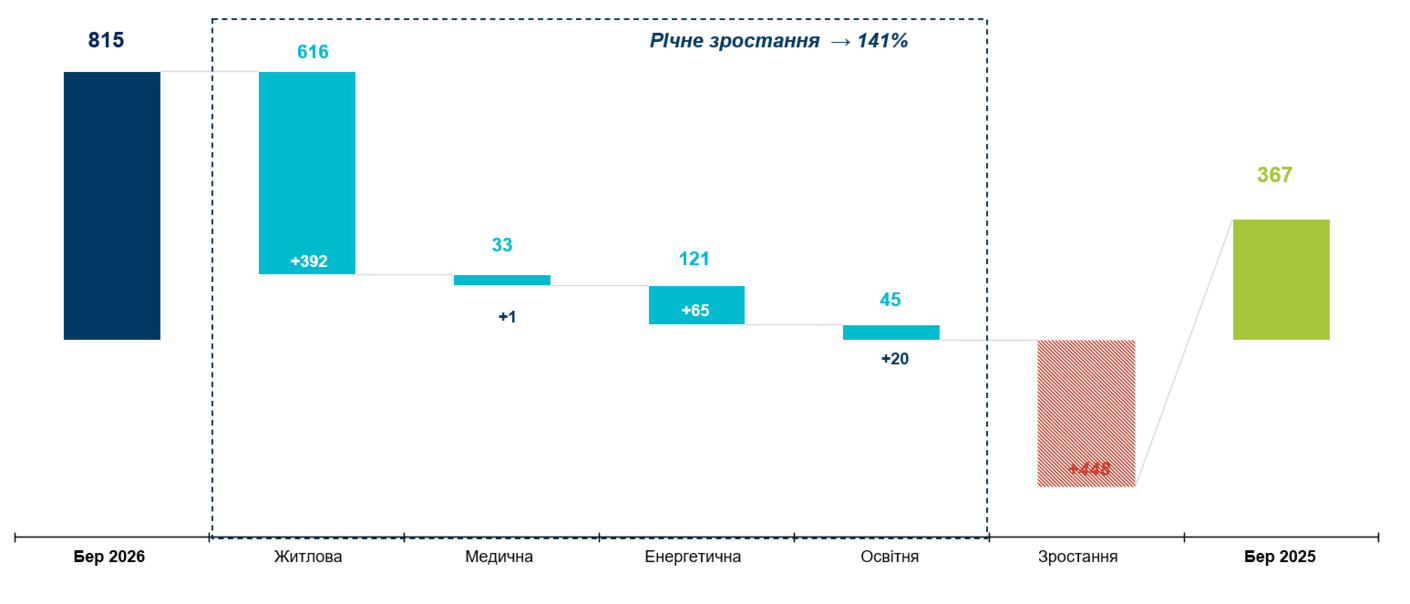Головний матеріальний слід війни й далі припадає на повсякденний простір життя громад – будинки, квартали, локальні мережі та базову інфраструктуру. Переважно страждає житлова інфраструктура: 72,4% усіх уражень у березні 2024 року, 66,5% у 2025-му і 75,6% у 2026-му. У березні цього року із 815 зафіксованих уражень 616 припали на житлові об’єкти. Енергетична інфраструктура - це ще 121 випадок, освітня45, а медична33.