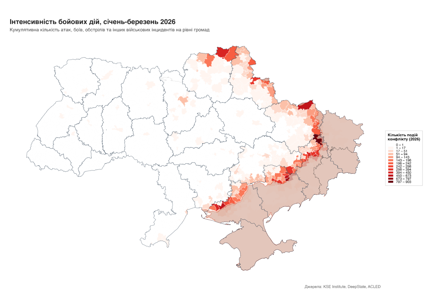 Рисунок 6. Інтенсивність бойових дій в громадах, березень 2026 (інтерактивна мапа)