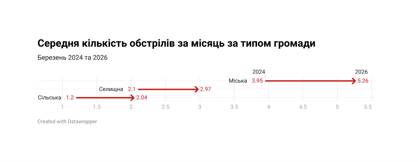 Війна стає дедалі менше прив’язана лише до прифронтових міських вузлів і дедалі більше заходить у сільський простір через повітряно-дроновий тиск. Якщо у березні 2024 року на повітряні та дронові удари там припадало лише 21,1% усіх обстрілів, то у 2025 році – вже 42,5%, а у 2026 році – 83,2%. Для порівняння, у міських громадах частка повітряних і дронових ударів зросла з 32,7% у березні 2024 року до 69,7% у березні 2026-го. Це видно і за середнім навантаженням у березні 2024 та 2026: у міських громадах кількість обстрілів у розрахунку на одну громаду виросла з 3,95 у 2024 році до 5,26 у 2026-му, але у сільських – з 1,20 до 2,04, тобто майже вдвічі.