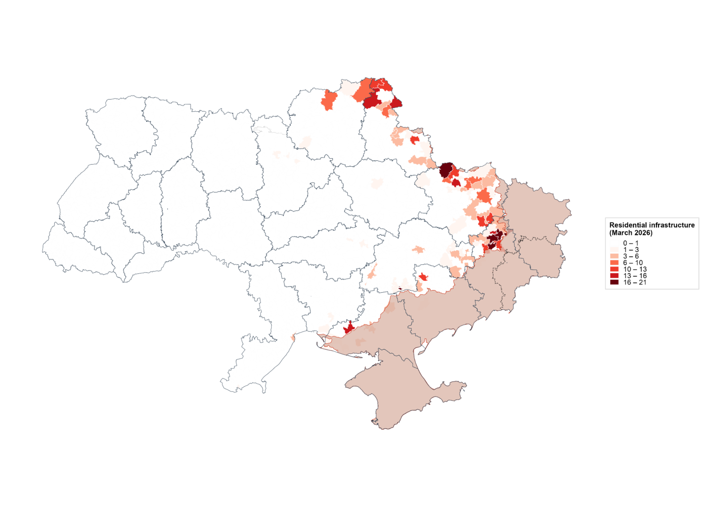 Порівняно з попередніми місяцями 2026 року березень не став місяцем полегшення. У лютому 2026 року в громадах під контролем України було зафіксовано 738 уражень цивільної інфраструктури, тоді як у січні кількість таких уражень становила 832. За кількістю уражень березень перевищив лютий і лише трохи поступився січню. Високий рівень безпекового тиску став новою нормою, а сама війна дедалі більше поєднує масований повітряний тиск на широкому просторі та концентровані матеріальні втрати в окремих громадах, які несуть непропорційно великий тягар руйнувань.