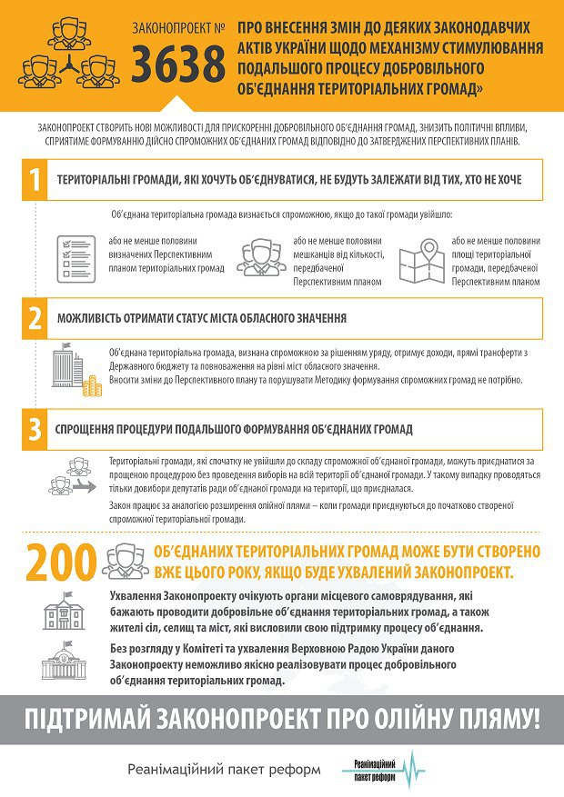 Вирішити ці дві проблеми та надати друге дихання для проведення децентралізації можуть законопроекти №3638 «Про внесення змін до деяких законодавчих актів України щодо механізму стимулювання подальшого процесу добровільного об'єднання територіальних громад»)» та №3639 «Про внесення змін до Бюджетного кодексу України (щодо механізму стимулювання подальшого процесу добровільного об'єднання територіальних громад)».