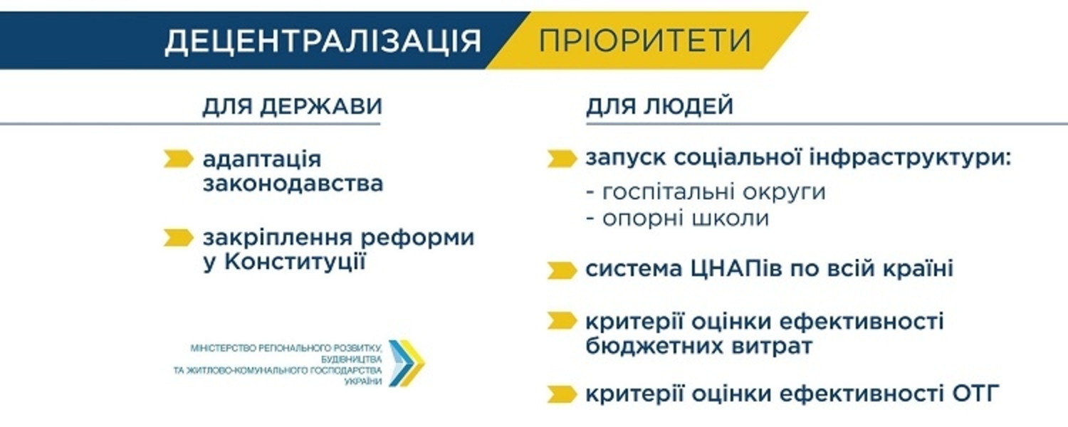 Також Віце-прем’єр-міністр повідомив, що в рамках розподілу повноважень між органами місцевого самоврядування та органами виконавчої влади за принципом субсидіарності необхідно визначити чіткі нормативи надання послуг у сфері освіти, охорони здоров’я, а також соціального захисту, охорони громадського правопорядку, створення протипожежної безпеки через власні підрозділи. «Це необхідно зробити для того, щоб забезпечити населення громад доступними та якісними послугами. Зокрема, перед нами стоїть завдання удосконалити формулу розрахунків державних субвенцій у сфері освіти та охорони здоров’я. Маємо сформувати карти опорних шкіл та можливих госпітальних округів на основі затверджених перспективних планів та затвердити конкретний перелік обов’язкових безоплатних послуг в галузі охорони здоров’я на первинному рівні», - наголосив Геннадій Зубко.