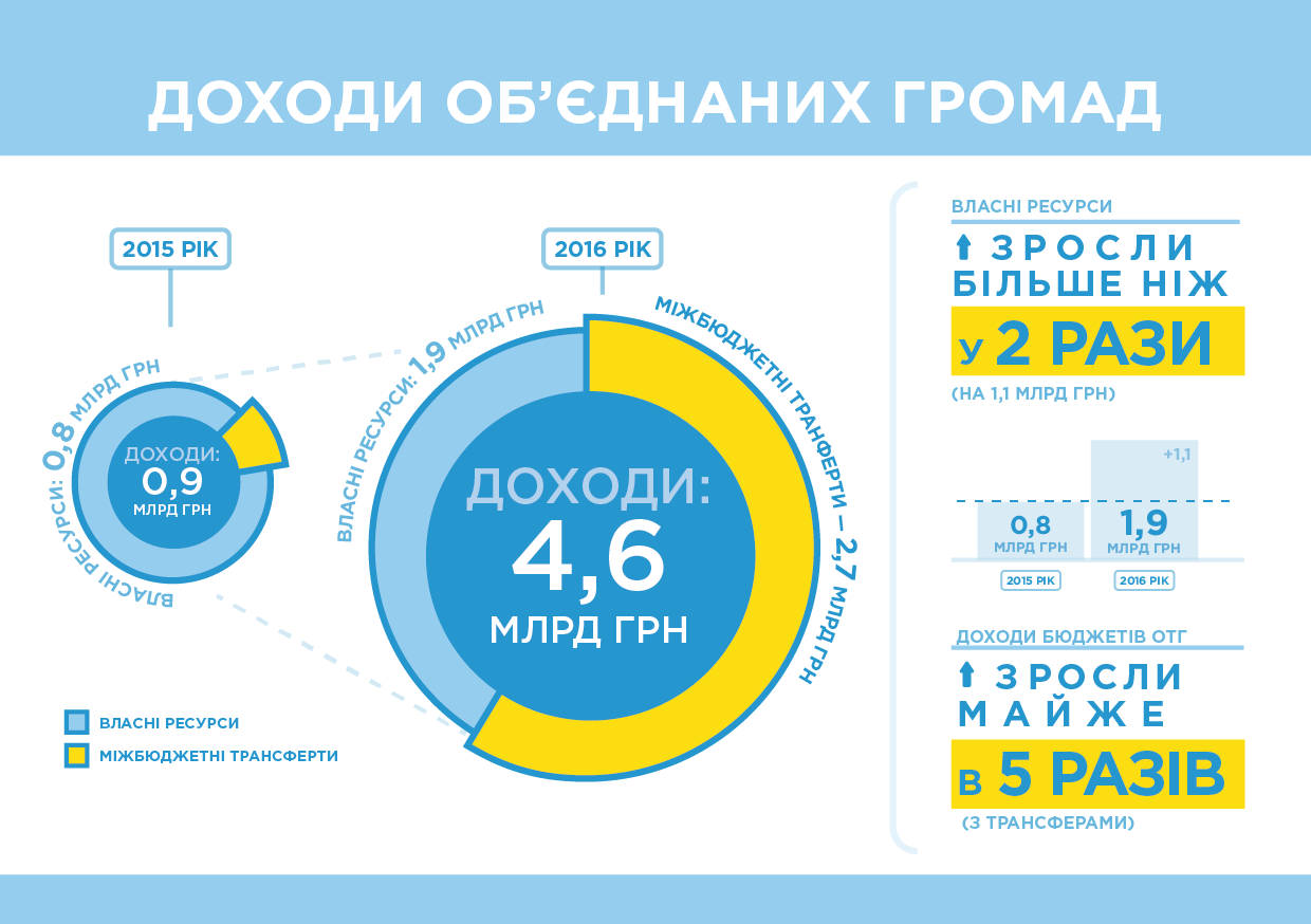 Завдяки змінам до податкового та бюджетного законодавства у контексті децентралізації обсяг власних доходів місцевих бюджетів об’єднаних громад зріс більше ніж у 2 рази: з 0,8 млрд грн у 2015 році до майже 1,9 млрд грн у 2016 році.
