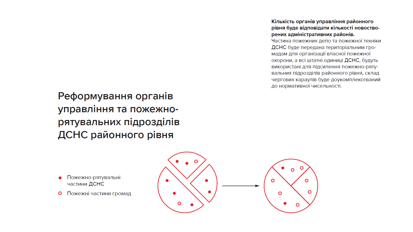 Кількість органів управління районного рівня буде відповідати кількості новостворених адміністративних районів. Частина пожежних депо та пожежної техніки ДСНС буде передана територіальним громадам для організації власної пожежної охорони, а пожежно-рятувальні підрозділи ДСНС районного рівня будуть підсилені, склад чергових караулів буде доукомплектований до нормативної чисельності.