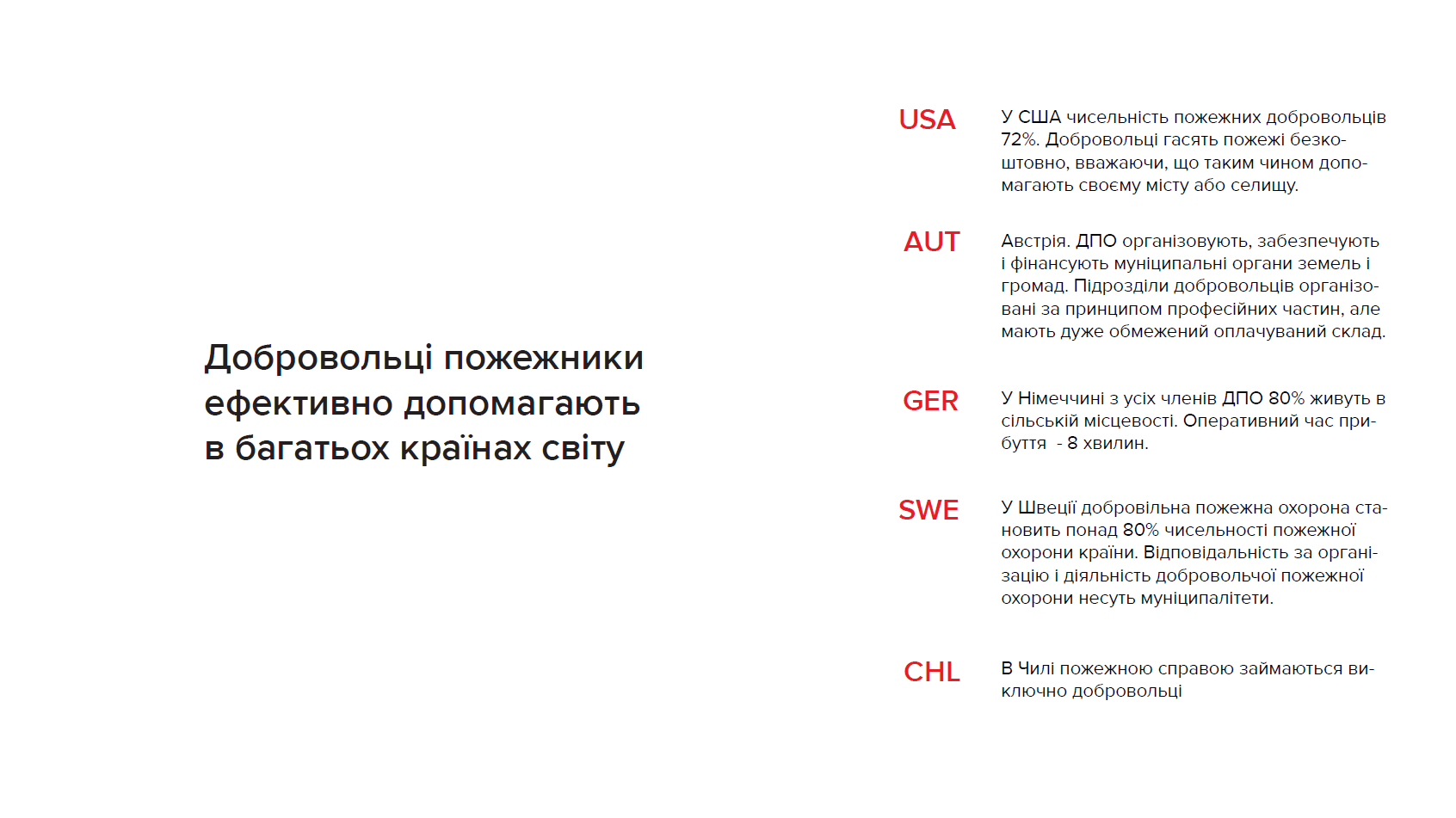 Така система роботи практикується у низці країн світу. У США 72% пожежників – добровольці, які гасять пожежі безкоштовно, вважаючи, що таким чином допомагають своєму місту або селищу. У Швеції добровольці складають 80% пожежної охорони країни.
