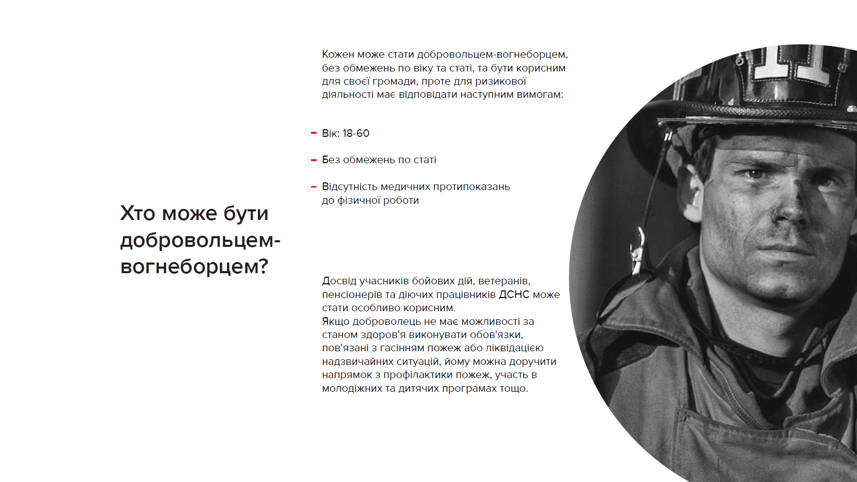 «Місцеві пожежні команди функціонуватимуть з мінімальною кількістю необхідного персоналу, проте на пожежах посилюватимуться силами добровольців-вогнеборців. До місцевих пожежних команд зможуть увійти як чоловіки, так і жінки. Єдині вимоги – вік (18-60 років) та відсутність медичних протипоказань до фізичної роботи», – сказав Арсен Аваков.