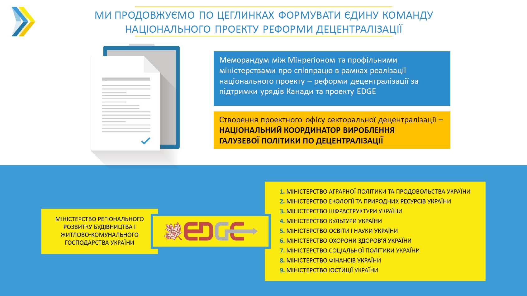 11 листопада 2016 року у Мінрегіоні підписано Меморандум про взаєморозуміння щодо підтримки впровадження секторальної децентралізації. Документ наразі уклали представники 7 українських міністерств, зокрема: