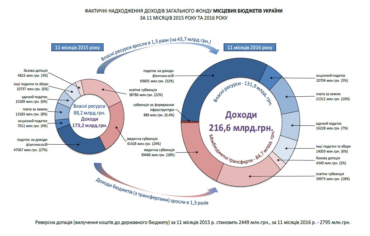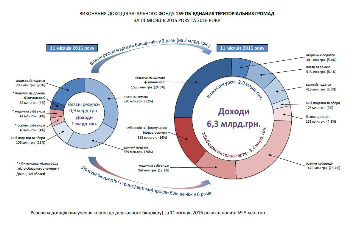 Завдяки змінам до податкового та бюджетного законодавства у контексті децентралізації надходження власних доходів місцевих бюджетів об’єднаних громад зросли більше ніж у 3 рази (на 2,0 млрд. грн.), порівняно з 11 місяцями 2015 року (з 0,9 млрд грн до 2,9 млрд грн).