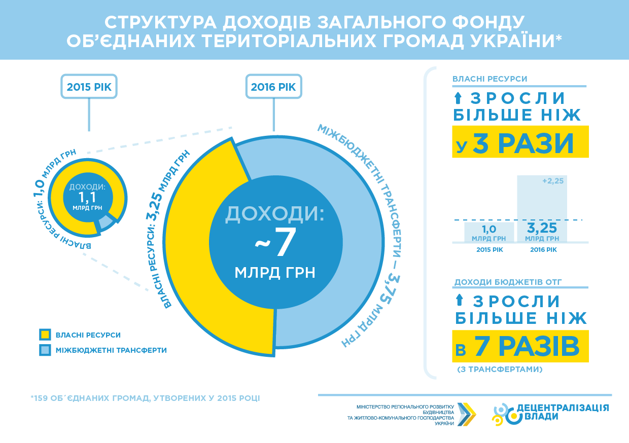 За даними, які навела експерт, за 2016 рік доходи загального фонду місцевих бюджетів 159 ОТГ, з урахуванням трансфертів з державного бюджету, склали 7 млрд грн, що більше, ніж у 7 разів порівняно з надходженнями 2015 року до бюджетів місцевих рад, які увійшли до складу ОТГ.