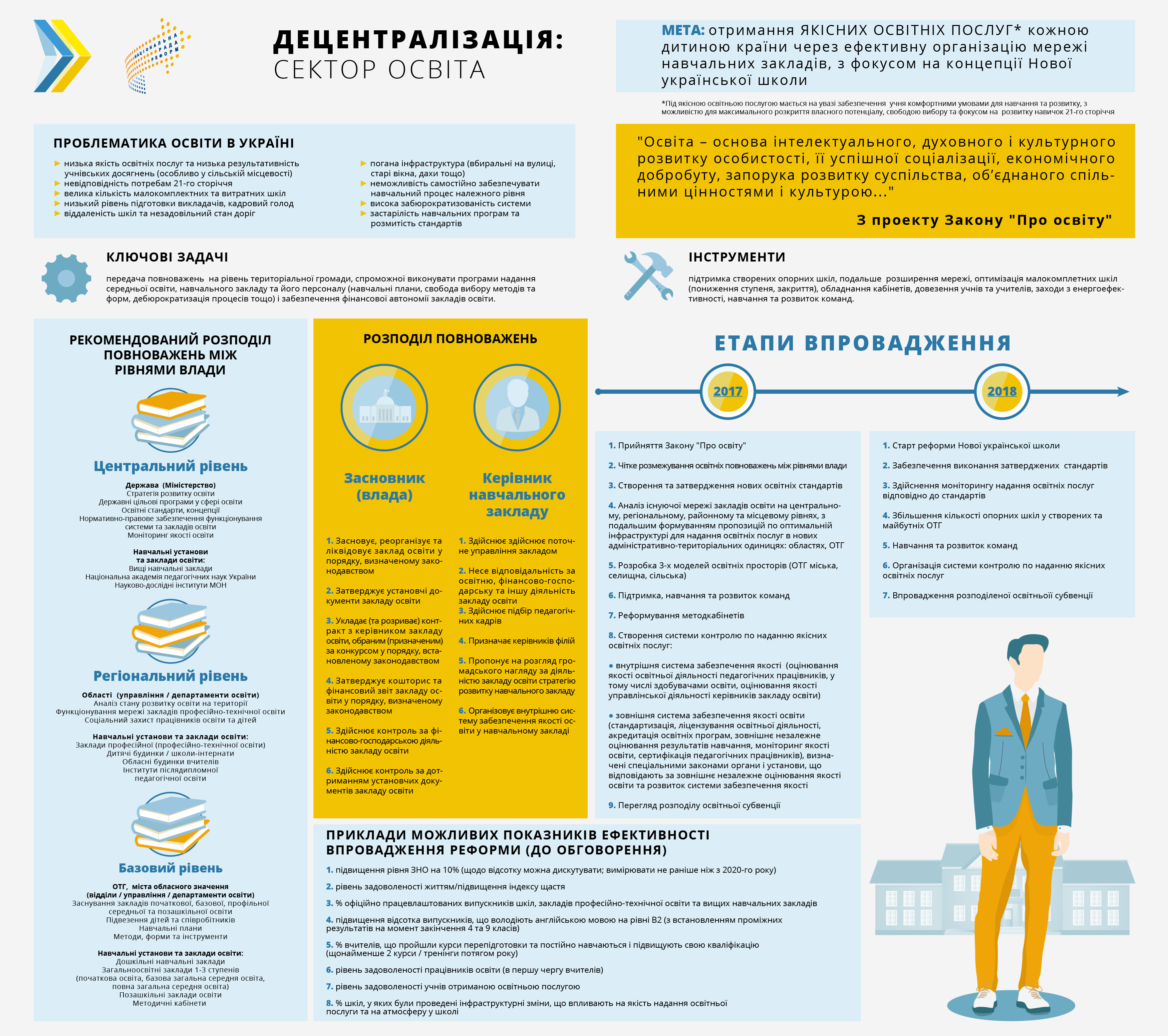 Концептуальне бачення реформи децентралізації освіти включає розподіл освітніх повноважень, ключові задачі, план впровадження на 2017 та 2018 рік та приклади можливих показників ефективності.
