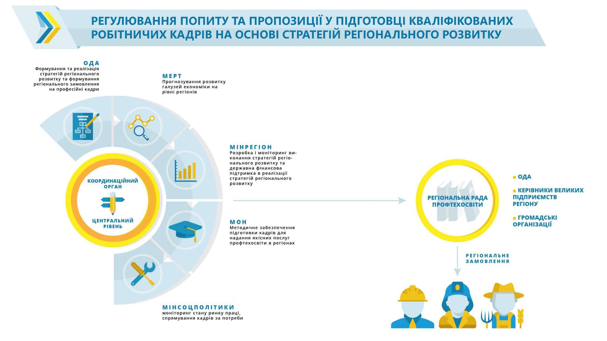«У процесі реформування системи ПТО мають бути задіяні чотири міністерства. В першу чергу, МОН, яке забезпечує стандарти, кваліфікації навчально-методичну підтримку. Далі, Мінекономрозвитку, яке визначає пріоритети розвитку економіки, в тому числі і для регіонів. Мінрегіон – відповідає за регіональний розвиток, координує реалізацію інфраструктурних проектів для визначення необхідності підсилення тієї чи іншої галузі. Мінсоцполітики – здійснює аналіз регіональних ринків праці, аналіз з точки зору Фонду зайнятості. Для того, щоб реформа відбулась, і ми дали нову якість ПТО, потрібно об’єднати всі ці напрямки», — зазначив Геннадій Зубко.