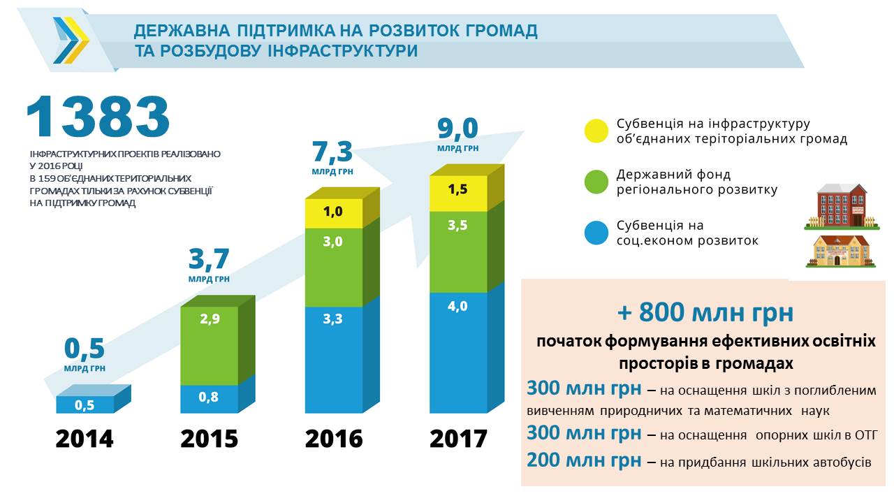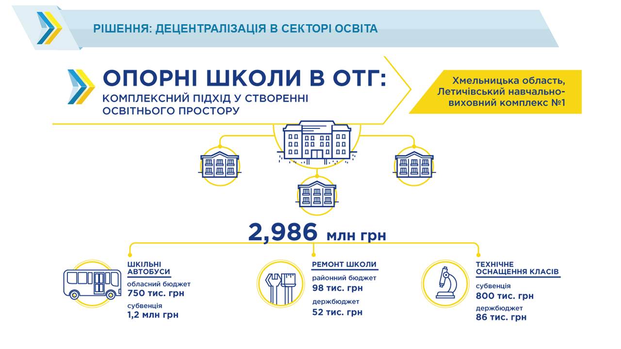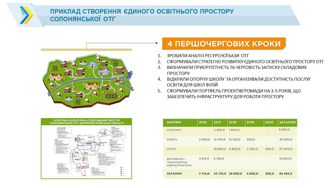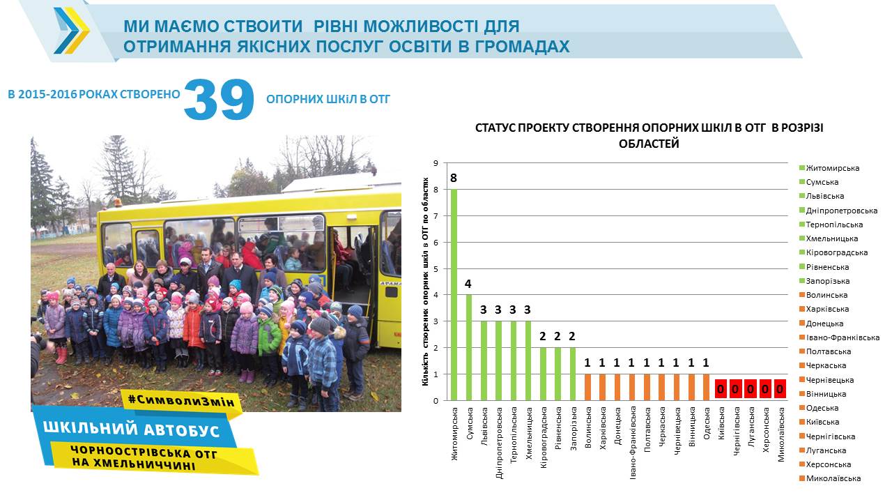 «Найбільш перспективним та вигідним для області є формування освітнього простору в об'єднаних громадах. Це дозволить на початковому етапі максимально оптимізувати інфраструктуру навколо та ефективно інвестувати кошти. За однакових умов при виборі школи для участі в проекті перевага надається навчальному закладу, який знаходиться в об'єднаній громаді. Адже наша мета – будувати освітній простір саме в опорних школах в ОТГ. Сьогодні в областях уже функціонує 178 опорних закладів та 511 їхніх філій. 39 з них - в ОТГ», – зазначив Віце-прем’єр.