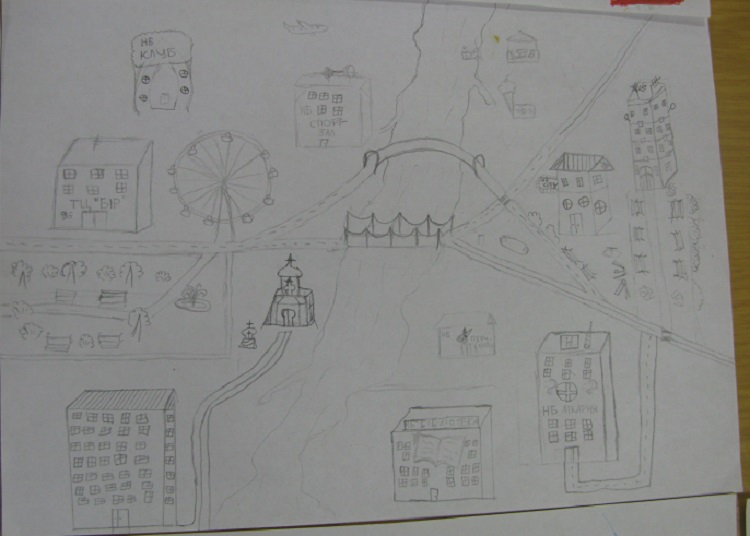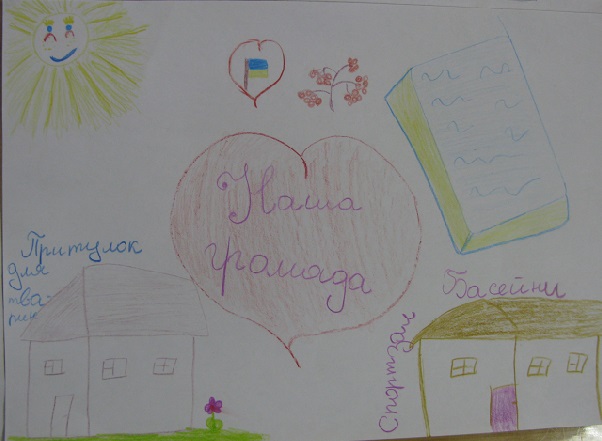 «У моєму селищі є багато магазинів, дві аптеки, три школи, два садочки, один музей та одне зданіє від сільської ради для ігор. Я б хотів, щоб у нас були фонтан, парки, музеї, дитячі майданчики, кафе, банки, мусорні баки, гарні дороги, заправка, зоопарк, заповідник, клумби, вуличні телефони, будинок для безпритульних собак і котів. Все це може трапитися у майбутньому. Журавська Віка, 5 клас».