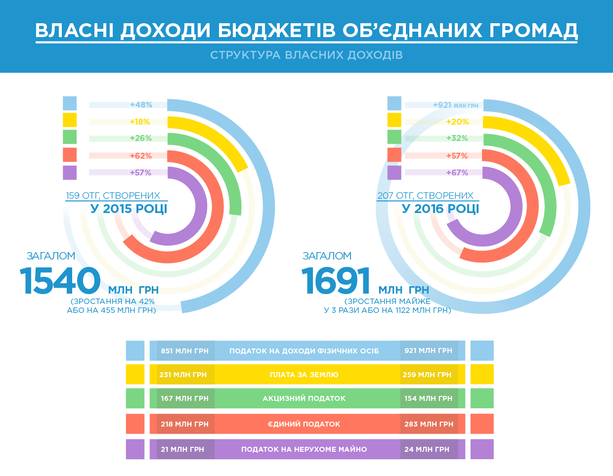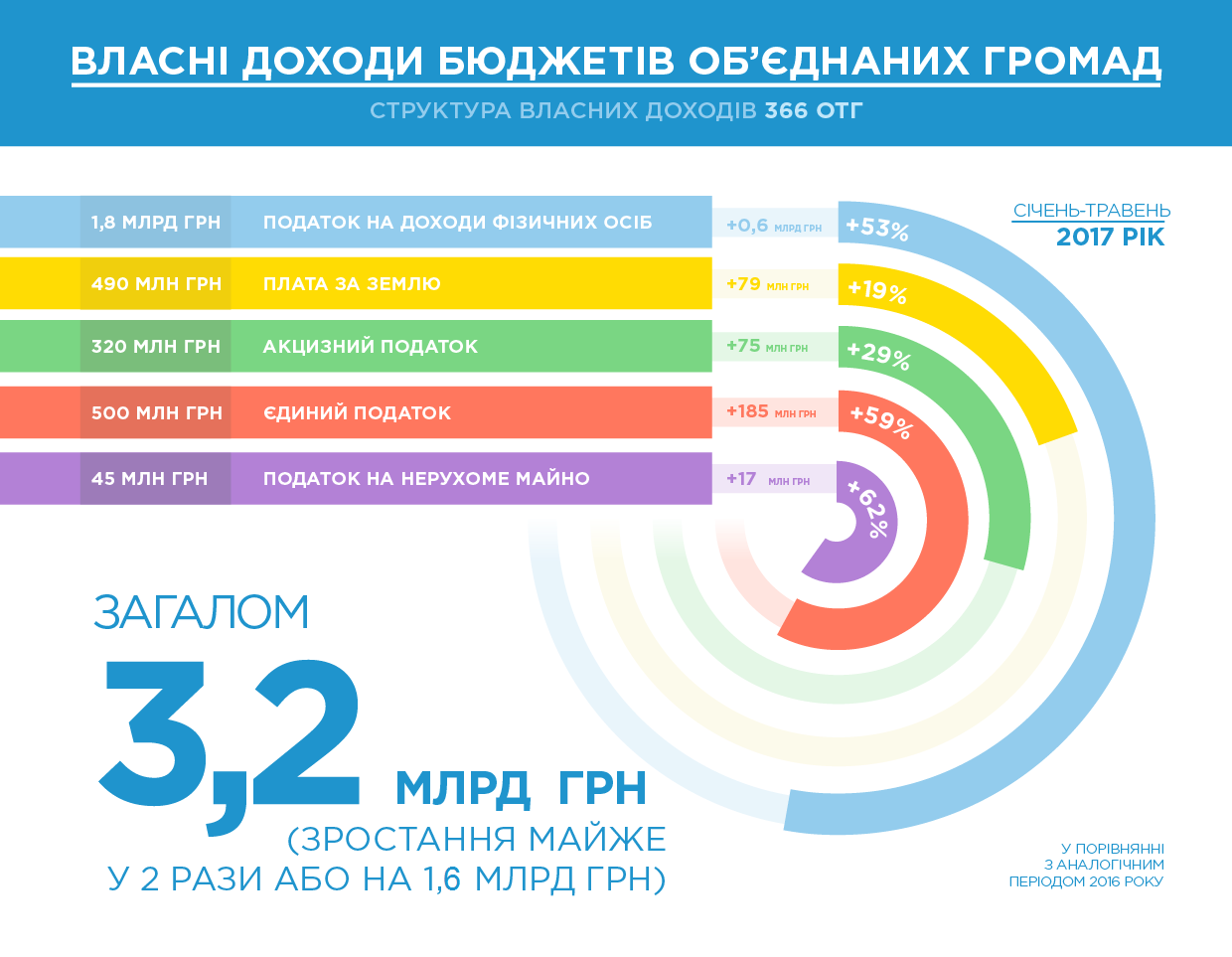 Отже, власні доходи місцевих бюджетів 366-ти ОТГ зросли майже у 2 рази та склали 3,2 млрд грн (+1,6 млрд грн).
