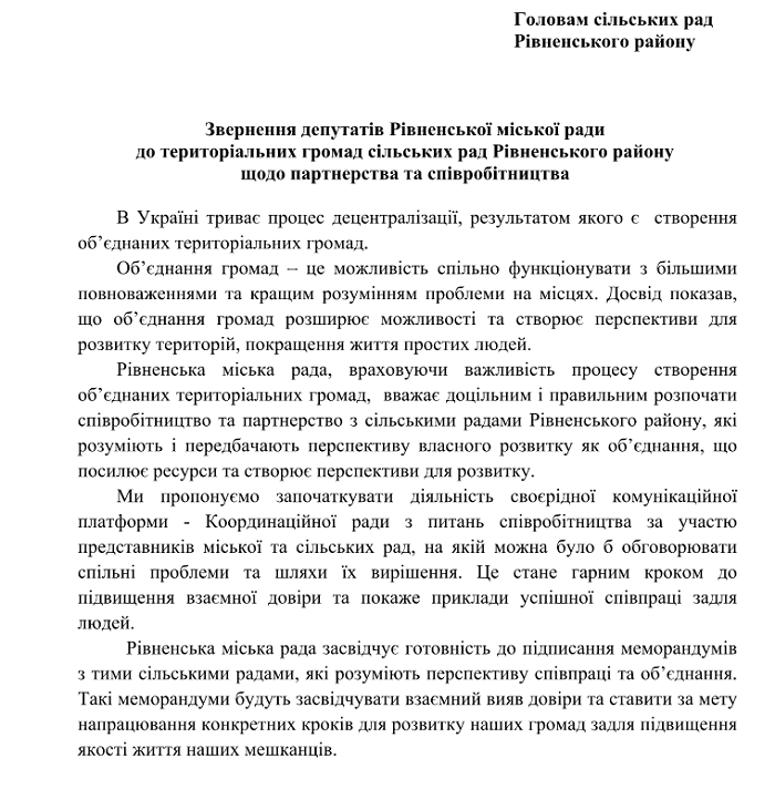 У цьому зверненні пропонується започаткувати діяльність своєрідної комунікаційної платформи - Координаційної ради з питань співробітництва за участю представників міської та сільських рад, на якій можна було б обговорювати спільні проблеми та шляхи їх вирішення. Також Рівненська міськрада пропонує сільрадам підписати меморандуми про співпрацю, як перший крок на шляху об’єднання.