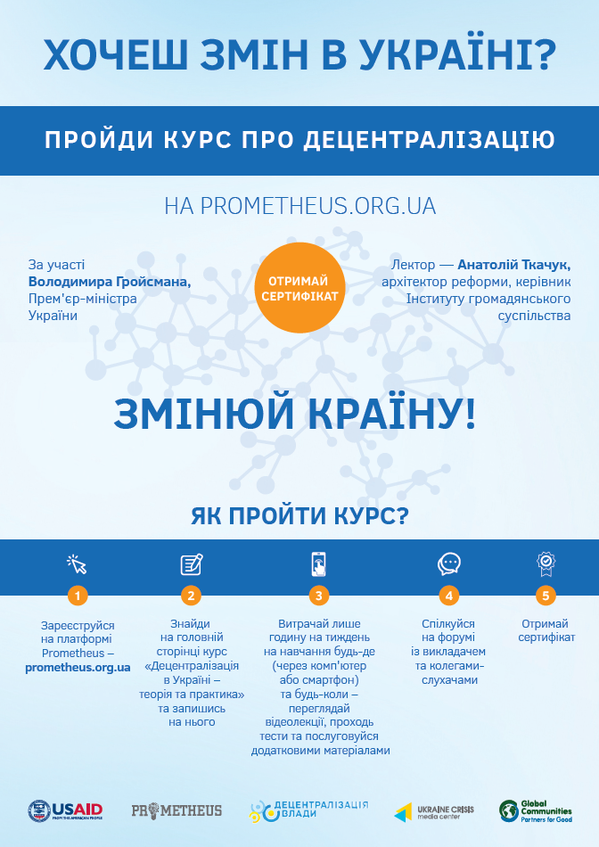 Триває реєстрація на онлайн-курс «Децентралізація в Україні – теорія та практика» за участі прем'єр-міністра України Володимира Гройсмана.