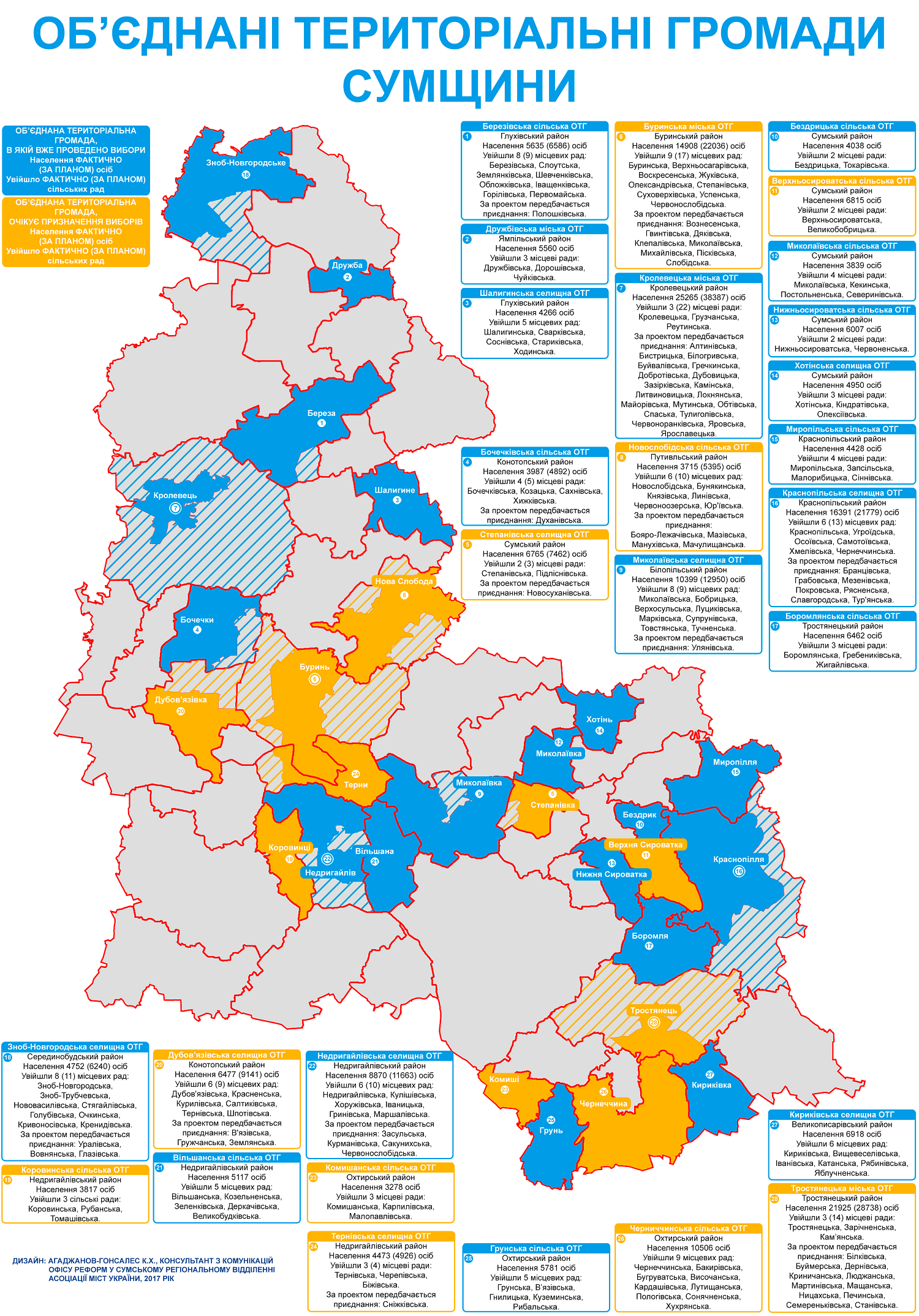 У 2017 році активність громад у напрямку об’єднання продовжується. На разі з початку року утворено 13 ОТГ, з яких 30 квітня пройшли вибори в 4 ОТГ (Краснопільська, Кролевецька, Бочечківська, Вільшанська), ще не пройшли вибори –