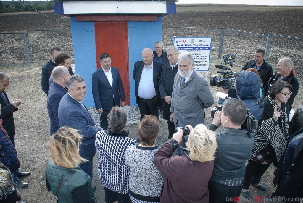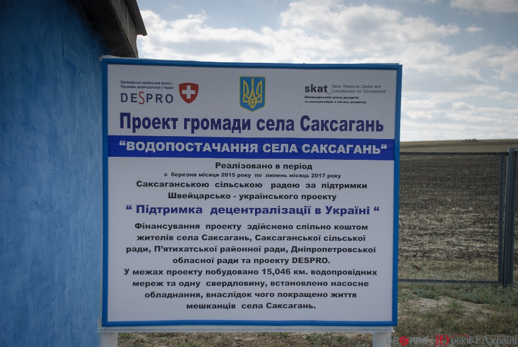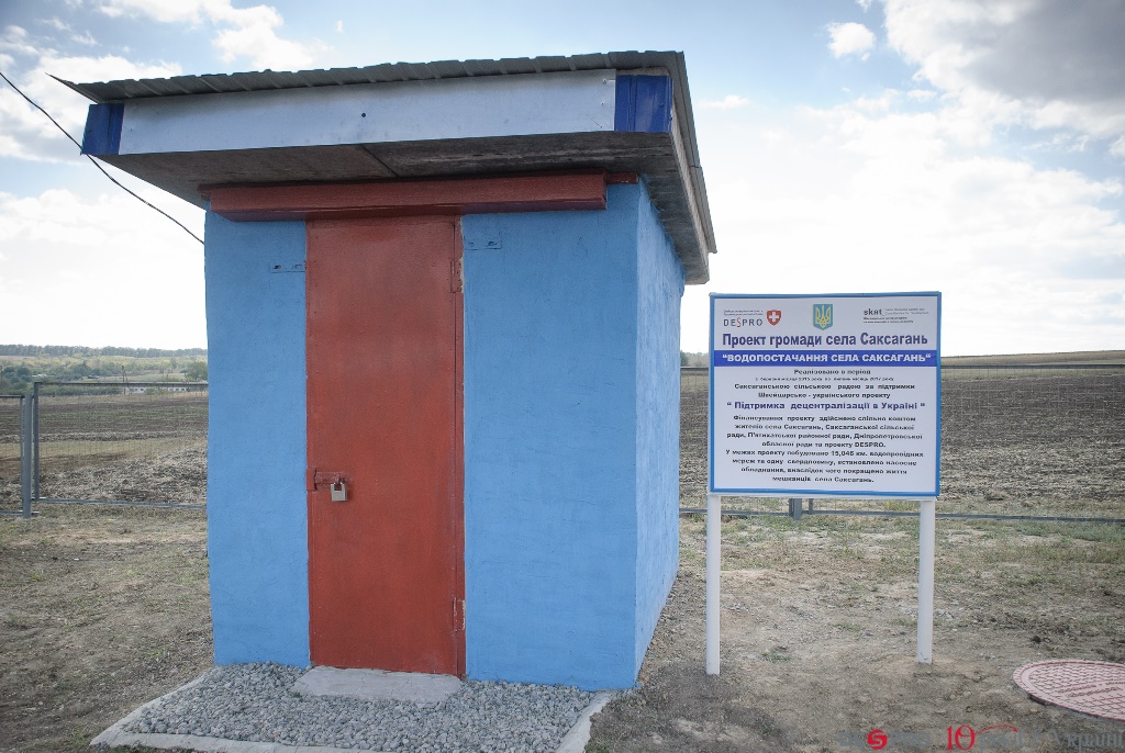 28 вересня в Саксагані (П’ятихатський район, Дніпропетровська область) відбулися урочистості з нагоди введення в експлуатацію системи водопостачання села, зведеної в рамках Швейцарсько-українському проекту «Підтримка децентралізації в Україні» DESPRO та Дніпропетровської обласної ради. Протягом 2015-2017 рр. було побудовано – 15,05 км водопровідної мережі, водонапірна башта Рожновського об’ємом 50 куб.м, резервна водозабірна свердловина, придбано 2 насоси, побудовано 32 переходи під автопроїздами для влаштування дворових підключень», облаштовано санітарну територію біля свердловини.